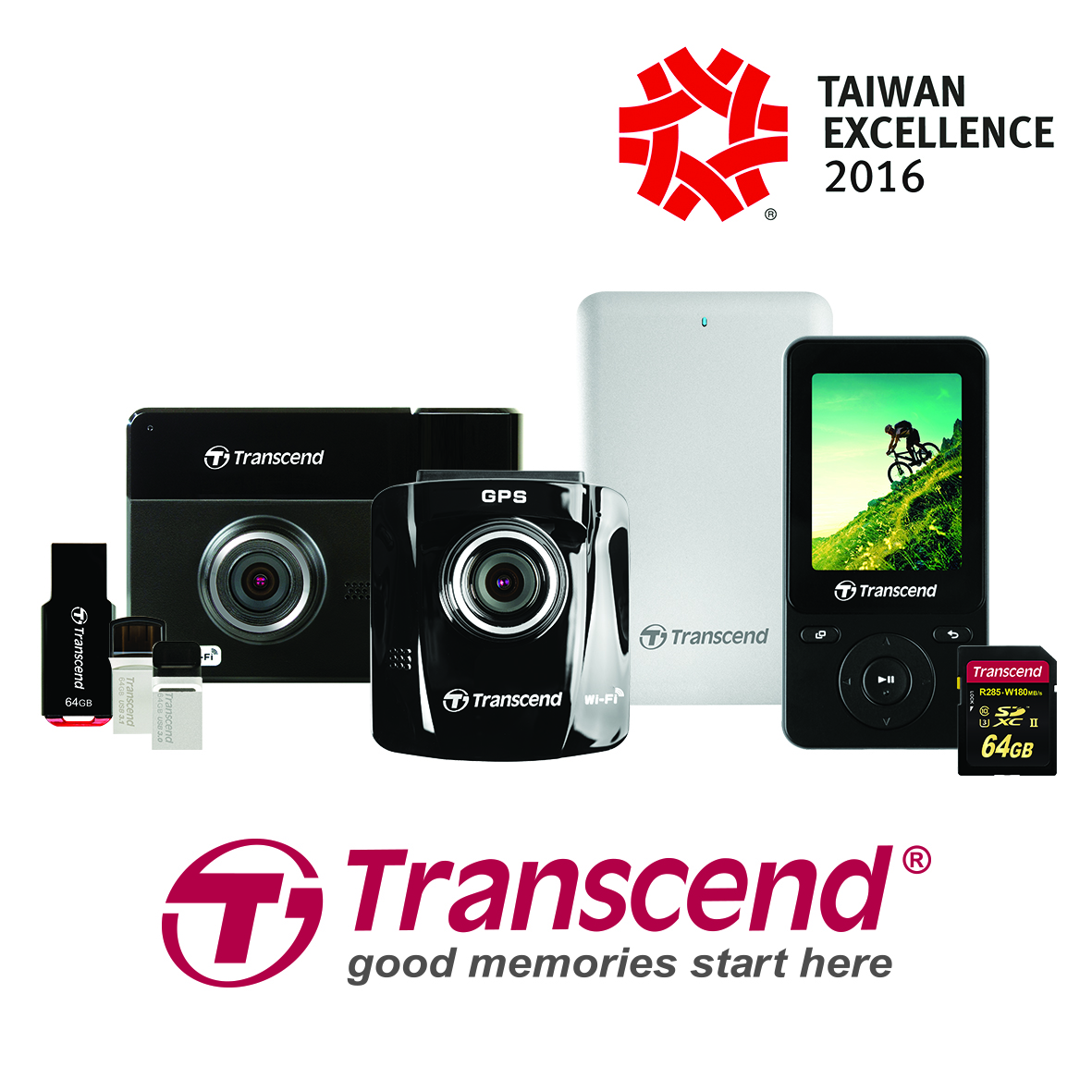 Transcend Information, Inc. (Transcend), a worldwide leader in storage and multimedia products, is proud to announce that eight of its cutting-edge products were awarded the “2016 Taiwan Excellence Award.” The award-winning products include the DrivePro 520 and DrivePro 220 car video recorders, the StoreJet 500 portable SSD for Mac, the MP710 digital music player, the JetFlash 890 and JetFlash 880 for mobile storage, the JetFlash 310 capless USB flash drive, and the SDXC/SDHC Class 3 UHS-II SD memory card.