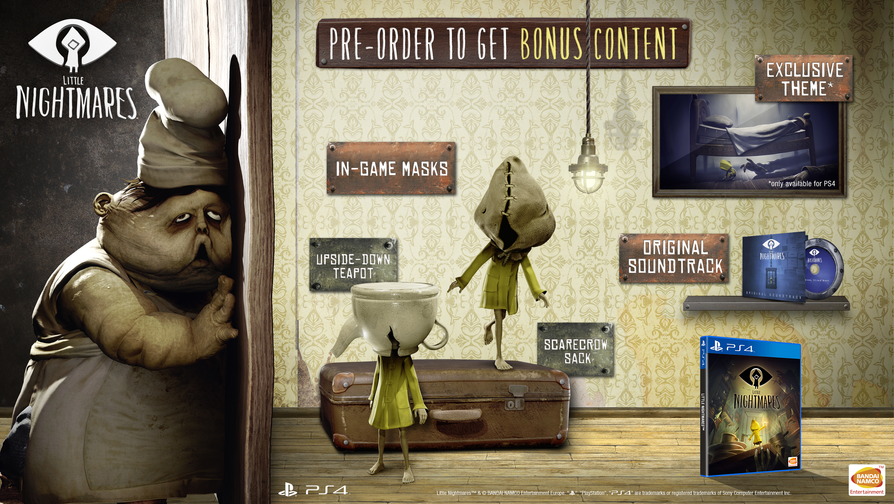 By pre-ordering*, all players will receive The Scarecrow Sack and the Upside-down Teapot Masks to help Six blend in with the other inhabitants of The Maw. PS4™ and PC users will also receive the original soundtrack in digital format, an exclusive PS4™ theme or a PC wallpaper featuring The Janitor.