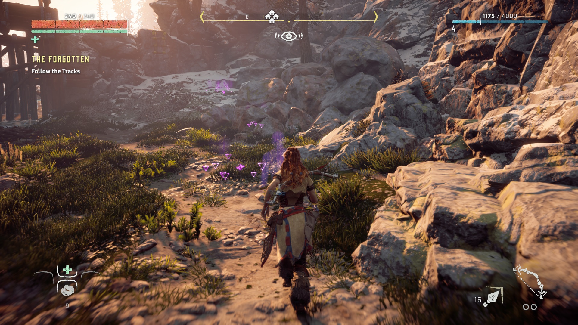 There are a ton of weapons and traps that are at your bay to take on the Machines head-to-head, lay down shock traps to cripple them momentarily then aim a fire arrow with your short bow or use the Ropecaster to pin them and take them down with your melee spear. There are many ways to taken them down as all it takes is your creativity and good observation when in battle. You can even do a momentary slow motion effect that also zooms you into a target, giving you a short amount of time to place a critical shot to a target and this can be done while stationary, jumping and even sliding. The health features a very unique style where you can stash medicinal herbs to fill up a reserved meter that you can use to replenish your health at any time when taking heavy damage, it adds an urgency to stack up before venturing encouraged you to gather items in your surroundings. The Focus Vision allows you to scan the area for any possible items or life forms that you can interact. This is also your method of identifying the Machines for possible weak points and revealing their track patterns which is perfect for sneaking enemies, this also needed to navigate around ruins from the metal world and scanning audio files and text logs to supplement your thirst for information.