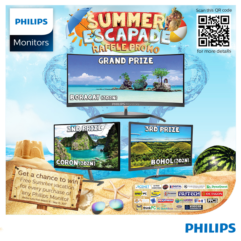 To join the raffle promo, submit your proof of purchase and complete information at www.philipsmonitorspromos.com. Three (3) winners will be drawn on May 17. Announcement of winners through the Philips Monitors Official Facebook Page (www.facebook.com/philipsmonitors) is on May 27, 2017. Below are the prizes: