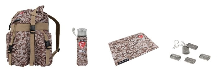 Better yet, MSI offers the following exclusive gifts: a camo backpack, a camo water bottle, a set of MSI themed dog tags, a camo mouse pad and a SteelSeries gaming controller. Show off your tough camo style in game-play and in daily life!