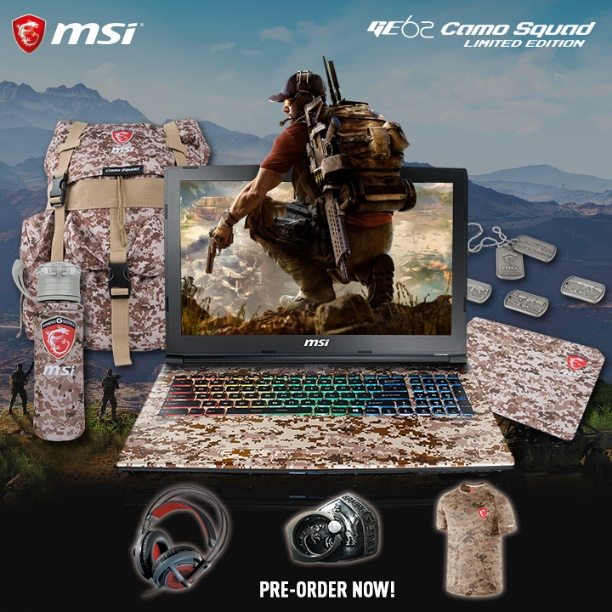 The GE62 Camo Squad is available for pre-order on April 10-23, only available at Complink. We will even add a SteelSeries Dota 2 Headset, MSI Cellphone Key Ring, and an exclusive MSI Camo Squad T-Shirt for everyone who will pre-order the Camo Squad notebook during the pre-order period.