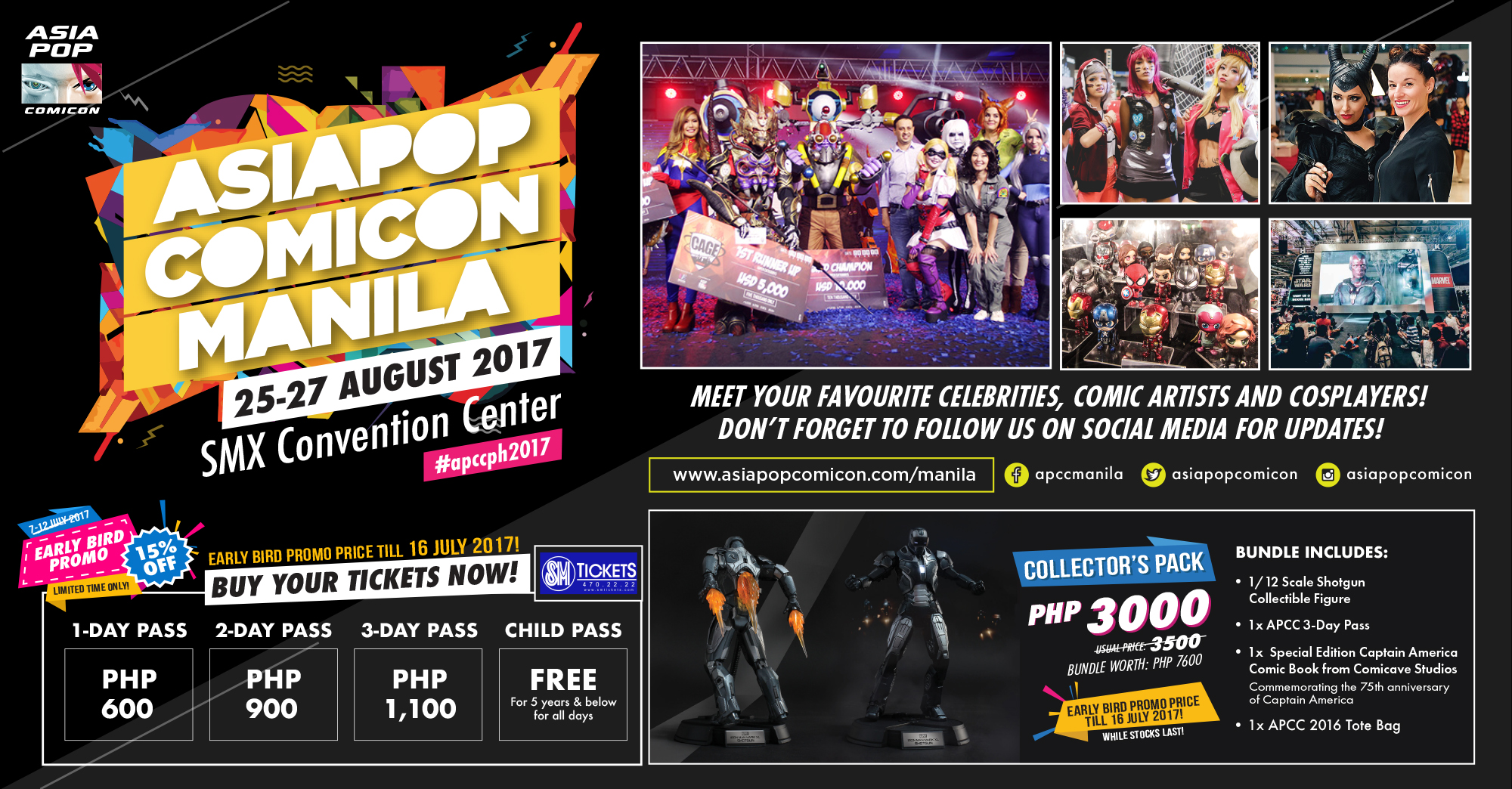 A limited edition Collector’s Pack is also available at a discounted price of PhP3000. This special offer is available for purchase at SM Tickets online (https://smtickets.com/events/view/5868) and SM Tickets outlets until July 16, 2017 or while supplies last. Ticket sales through SM Tickets has started on a robust note with various ticket packages being snapped while many have taken advantage of the early bird promo offers. For more information and event updates, visit www.asiapopcomicon.com/manila, or follow their official Facebook Page www.facebook.com/apccmanila, Twitter account @AsiaPOPComicon, and Instagram account @asiapopcomicon.