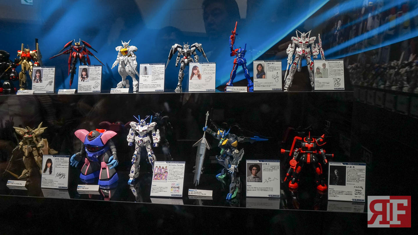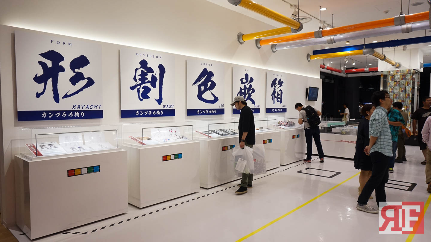 There is also a section filled with displays of different Gunpla kits, there is also a section that displays the different grades and how many runners it needed to hold the parts before assembly. Some works from other Gunpla enthusiasts are displayed along with some entries from previous Gunpla building competitions.