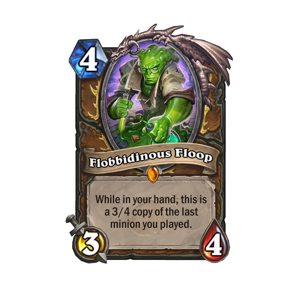 - Flobbidinous Floop – As the Druid class scientist, Floop is a 4 mana 3/4 Legendary minion, but while he’s in the player’s hand, he transforms into a 3/4 copy of the last minion played. Floop promotes open-ended deck building and allows players to experiment in wild ways.