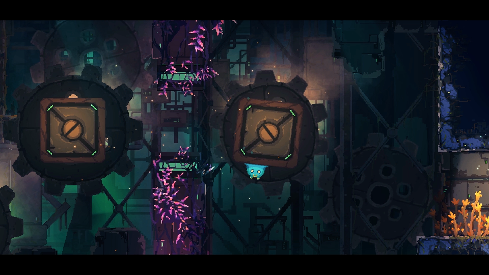 The gameplay is mainly focused on three methods: “Moving”, “Jumping and sticking” and “Controlling”. Other methods can be derived from these three as the environment of the levels changes. In the playable demo on-site at the event, players would control the main character as he traversed through a wide variety of environments drawn in the pixelated art style. Players would feel a sense of fluidity and speed as they cleared the levels.