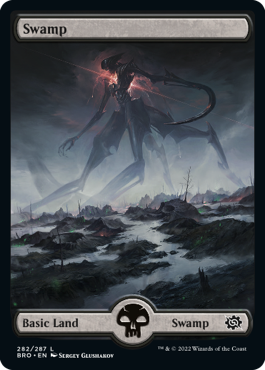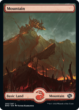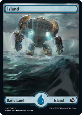 10 full-art basic lands convey a story of their own, showcasing the colossal locations and mechanical behemoths that fought underneath Urza and Mishra during the war.