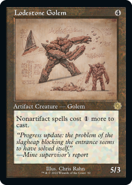 With the plane entrenched in mech warfare, The Brothers’ War is a set heavily focused on artifacts. Among these include Powerstones, colorless artifact tokens first introduced in Dominaria United that can be tapped for additional mana that cannot be used on non-artifact spells. Prototype, another mechanic seen on artifact creatures, is an alternate cost for giant mechs, allowing them to enter the battlefield for less mana but with less power, toughness, and abilities. The Brothers’ War also re-introduces fan-favorite mechanics such as Meld, a keyword that combines two cards to create one oversized card, and Unearth, which allows cards to return from the graveyard, with the cost of it being exiled at the end of the turn.
