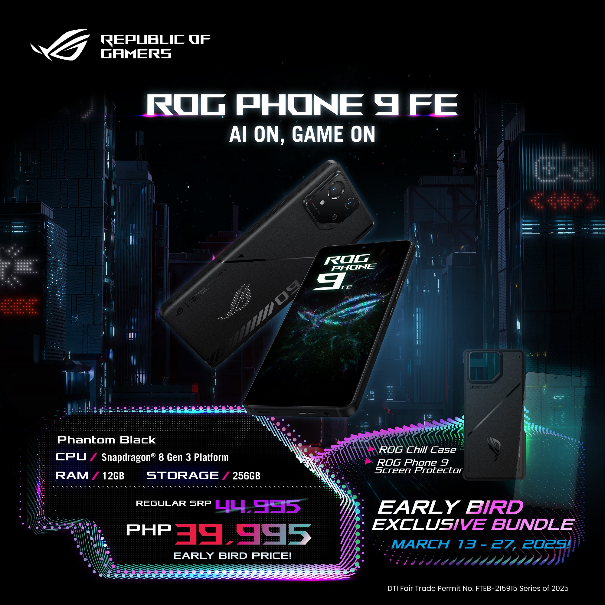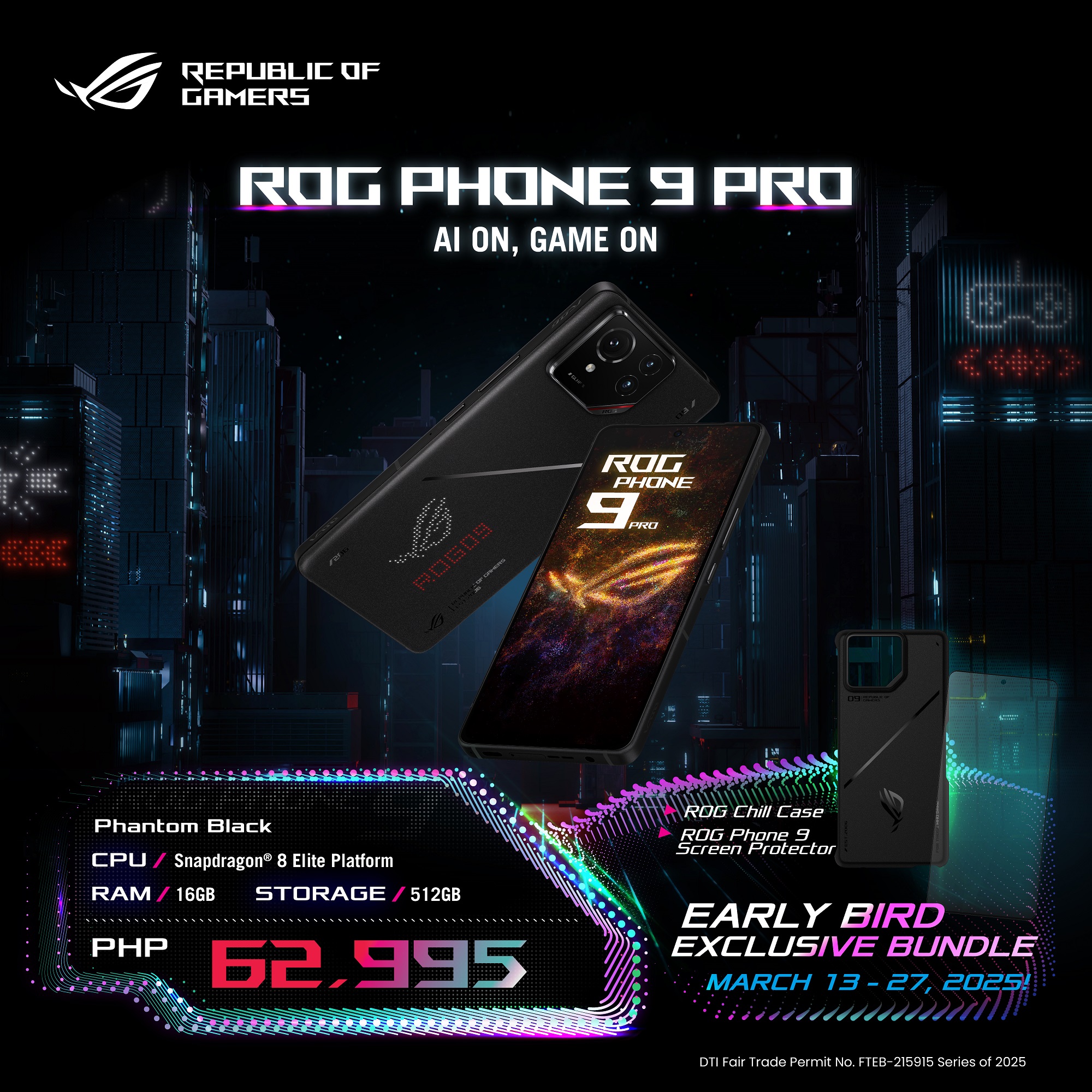 The ROG Phone 9 series is available at your nearest ASUS, ROG, and Multibrand Stores nationwide, with a one-year local warranty. Take advantage of our Early Bird Bundle Promotions, including a limited early-bird price for the ROG Phone 9 FE at ₱39,995 (Official SRP at ₱44,995) and bundled ROG Chill case and ROG Antibacterial Glass Screen Protector worth 3,990 PHP for any ROG Phone 9 series purchase! Additionally, fans can enjoy an exclusive 50% discount on selected accessories, including Aeroactive Cooler X and Devil Case (Guardian Gaming,) for an unparalleled ROG experience.