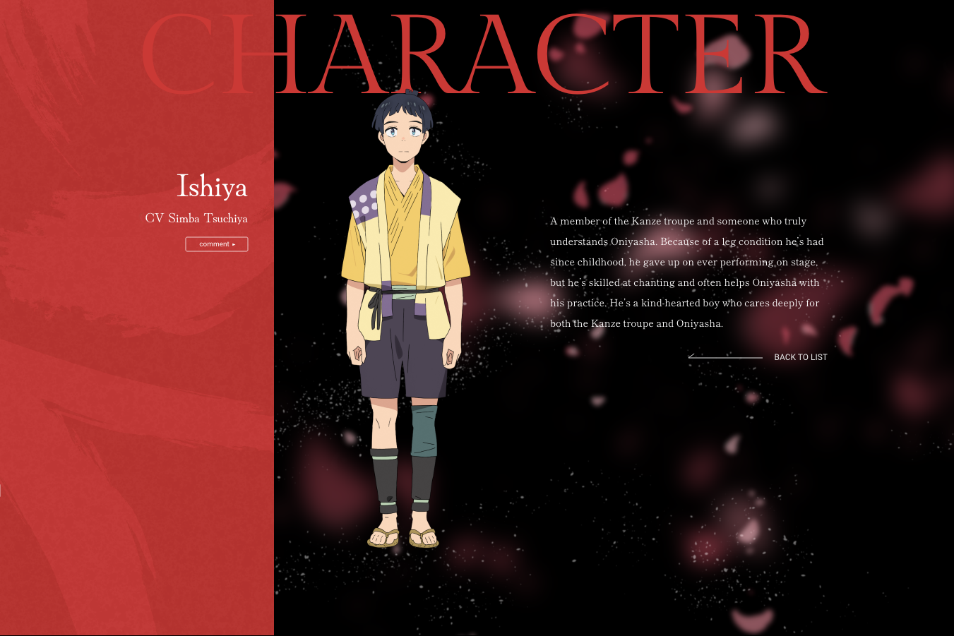 Ishiya – A member of the Kanze troupe and someone who truly understands Oniyasha. Because of a leg condition he’s had since childhood, he gave up on ever performing on stage, but he’s skilled at chanting and often helps Oniyasha with his practice. He’s a kind-hearted boy who cares deeply for both the Kanze troupe and Oniyasha.