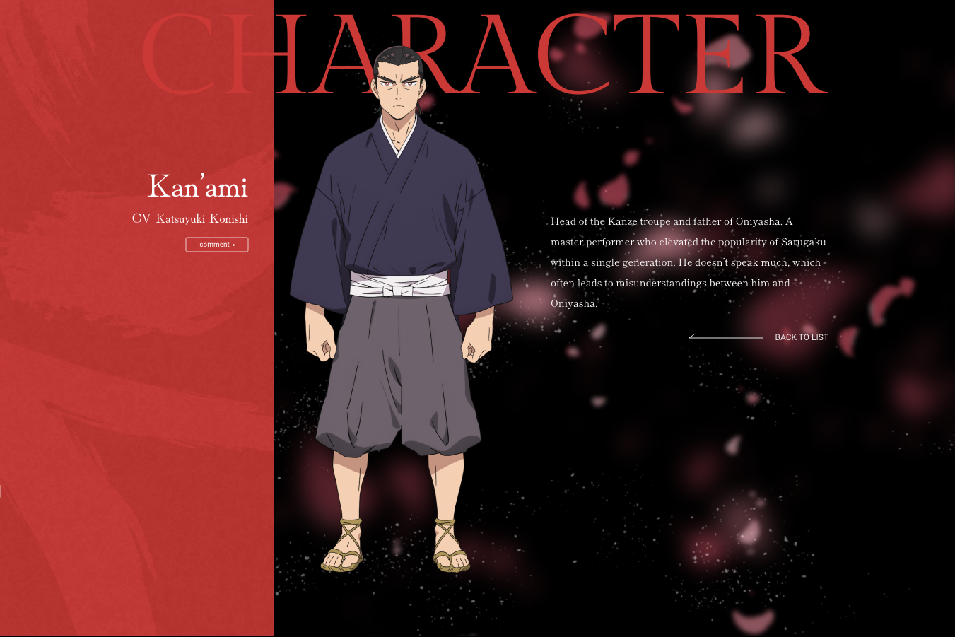 Kan’ami – Head of the Kanze troupe and father of Oniyasha. A master performer who elevated the popularity of Sarugaku within a single generation. He doesn’t speak much, which often leads to misunderstandings between him and Oniyasha.
