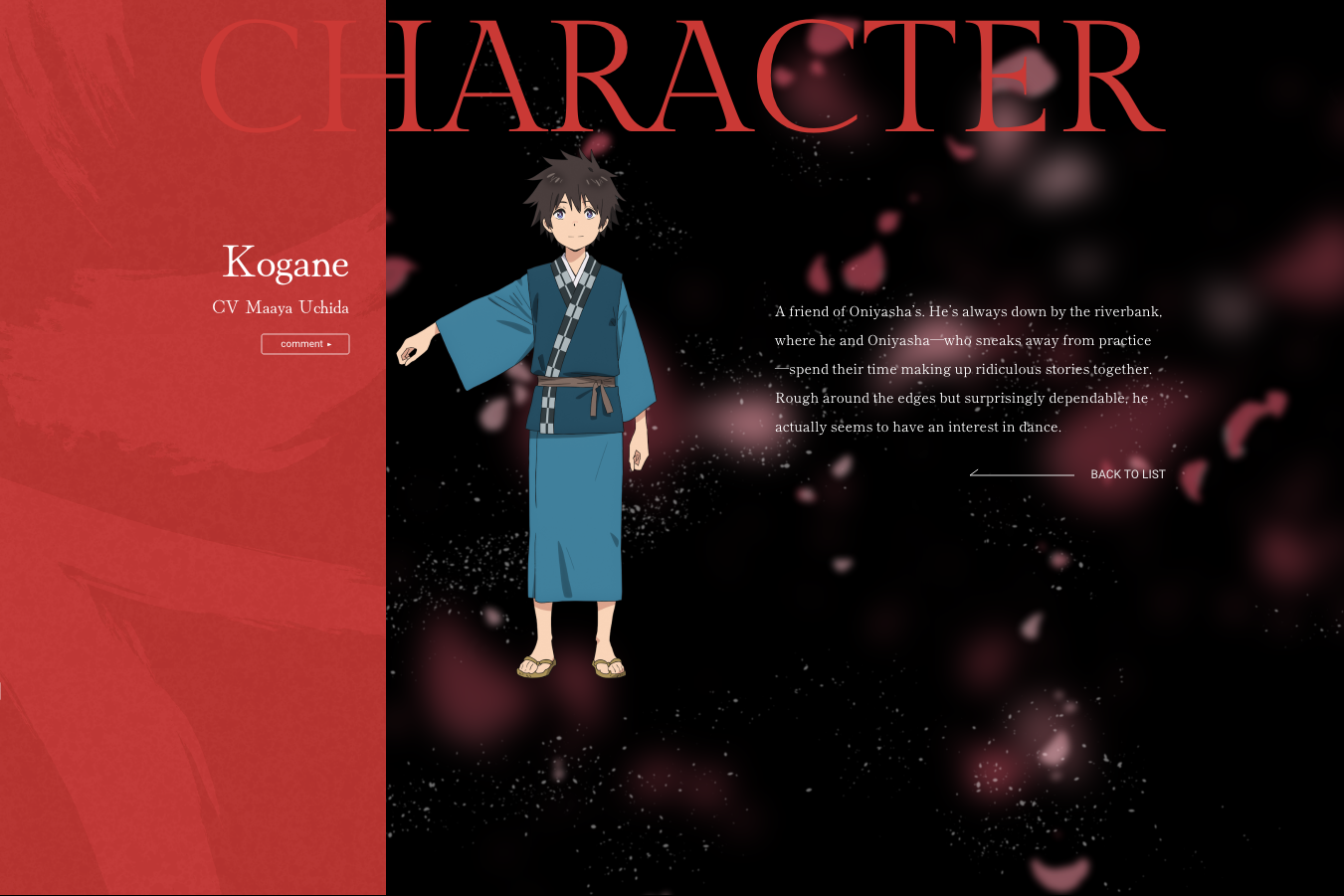 Kogane – A friend of Oniyasha’s. He’s always down by the riverbank, where he and Oniyasha —who sneaks away from practice—spend their time making up ridiculous stories together. Rough around the edges but surprisingly dependable, he actually seems to have an interest in dance.