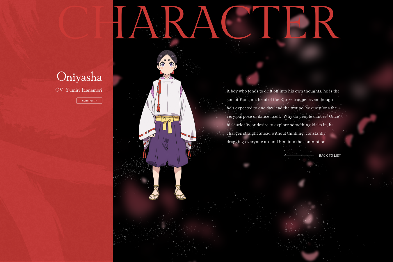 Oniyasha – A boy who tends to drift off into his own thoughts, he is the son of Kan’ami, head of the Kanze troupe. Even though he’s expected to one day lead the troupe, he questions the very purpose of dance itself: “Why do people dance?” Once his curiosity or desire to explore something kicks in, he charges straight ahead without thinking, constantly dragging everyone around him into the commotion.